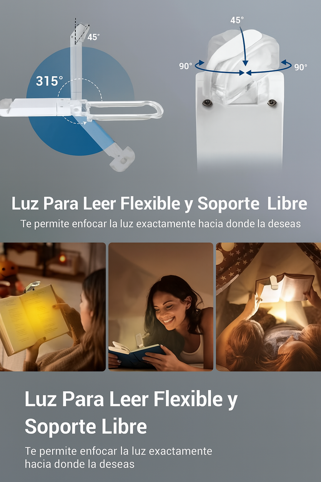 Clip universal: se ajusta a libros, tablets o cabeceras.